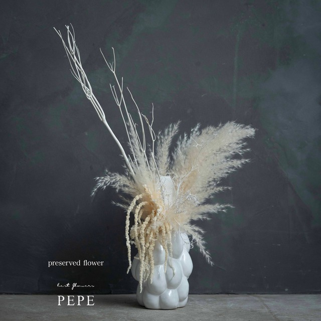 凛とした静けさを、空間に。 縦のラインが印象的な、プリザーブドフラワーアレンジメント。 パンパスグラスや繊細な枝ものを重ね、 軽やかさと凛とした存在感をあわせ持つデザインに仕上げました。 高さのあるシルエットが空間に自然なリズムを生み、 置くだけで視線を引き寄せる、洗練された佇まいです。 花器には、マットな質感のシンプルなベースを使用。 甘さを抑えた色合いなので、 ナチュラルインテリアはもちろん、 モダンな空間や店舗ディスプレイにもよく馴染みます。 プリザーブドフラワーのため、 お水替えなどのお手入れは不要。 美しい状態を長くお楽しみいただけます。 新生活のお祝いや、開店・開業祝い、 大切な方への節目のギフトにもおすすめです。 落ち着いたデザインなので、 性別や年齢を問わず贈りやすいのも魅力のひとつ。 ・玄関やリビングのアクセントに ・サロンやショップの空間づくりに ・特別な想いを伝える贈りものとして 控えめなのに、心に残る。 そんなフラワーアレンジをお探しの方へ。 メッセージカードの代筆も承ることが可能ですので、 ご希望ございましたら購入画面の備考欄にご記入いただきますようお願いいたします。 (例.●御祝 ○○株式会社 ●オープンおめでとうございます ●お誕生日おめでとう ●いつもありがとう ●末永くお幸せに ーサイズー 高さ 100cm 奥行 35cm 横幅 53cm ※プリザーブドフラワーは直射日光を避けた、湿気の少ない風通しのいい場所の保存して頂ければ半永久的に飾ることができます。 ※画像はイメージです。お色味に変更はありませんが、花材は変更になる可能性があります。 ※梱包料を頂く為、合計金額は店頭価格と異なります。ご了承下さいませ。 アレンジメント ナチュラルアレンジメント プリザーブドフラワー ドライフラワー アーティフィシャルフラワー ナチュラルフラワー 花束 花ギフト フラワーギフト 誕生日ギフト 記念日ギフト 結婚祝い 開店祝い 新生活 インテリアフラワー ナチュラルインテリア 大人ギフト おしゃれギフト flower shop pepe FLOWER SHOP PEPE