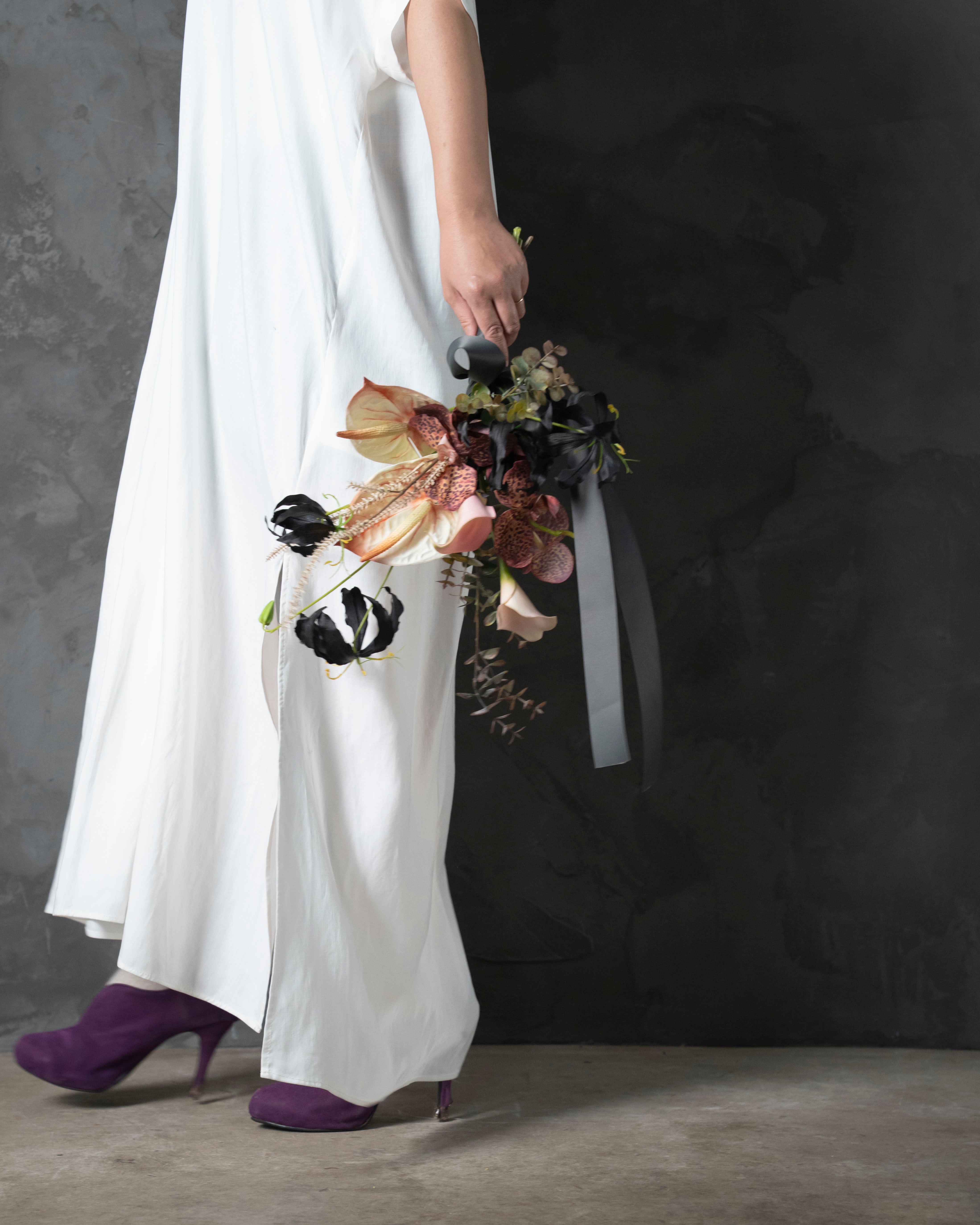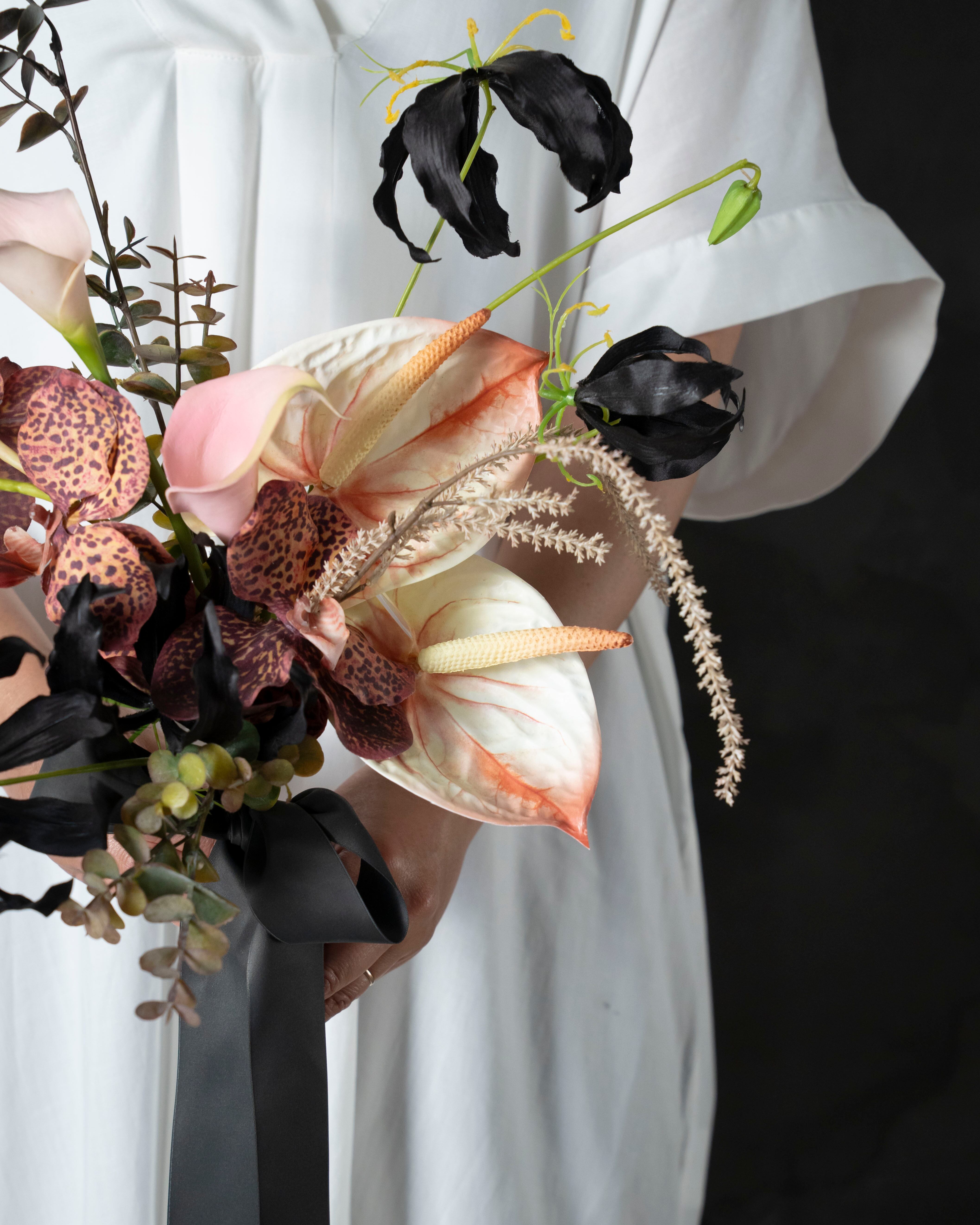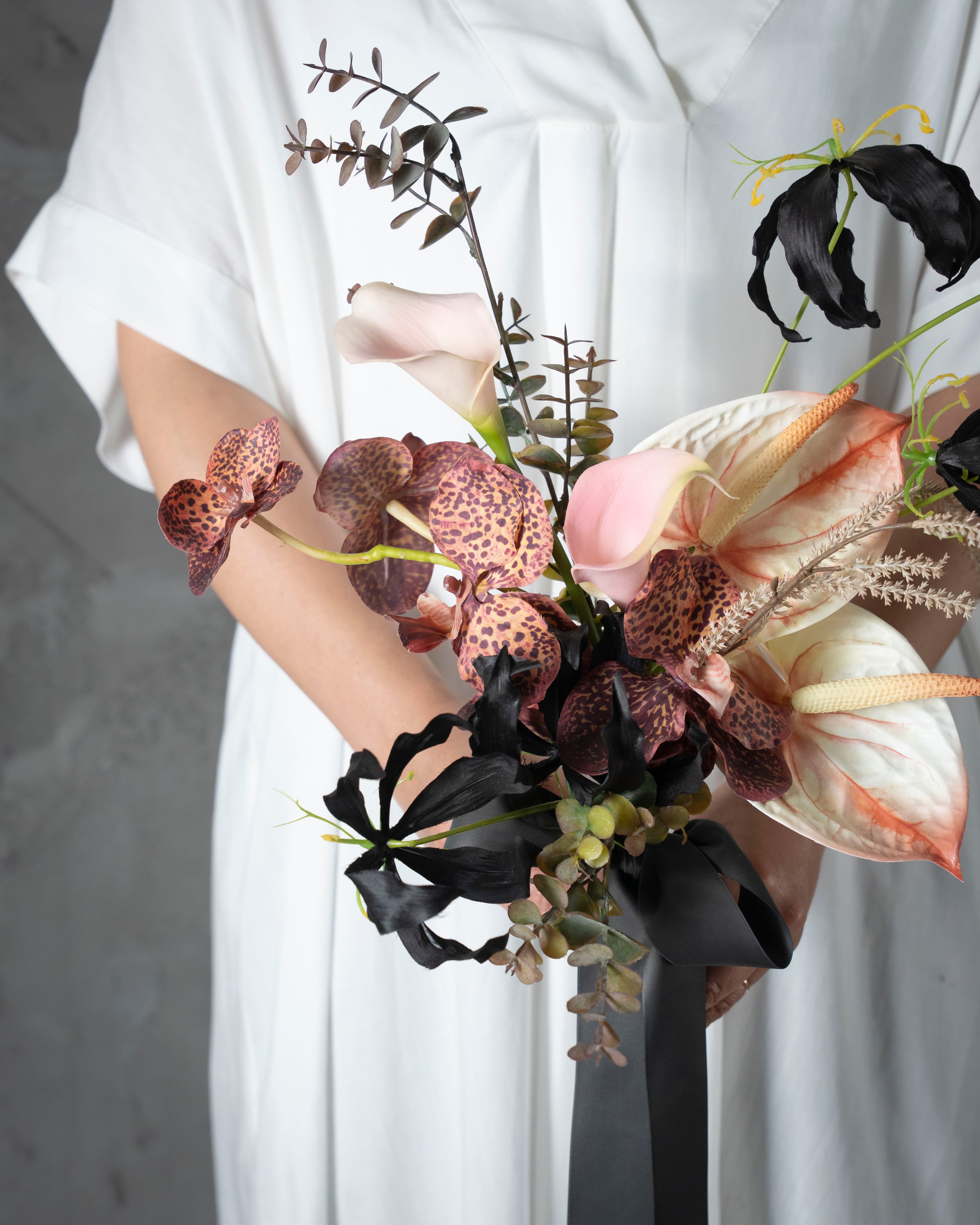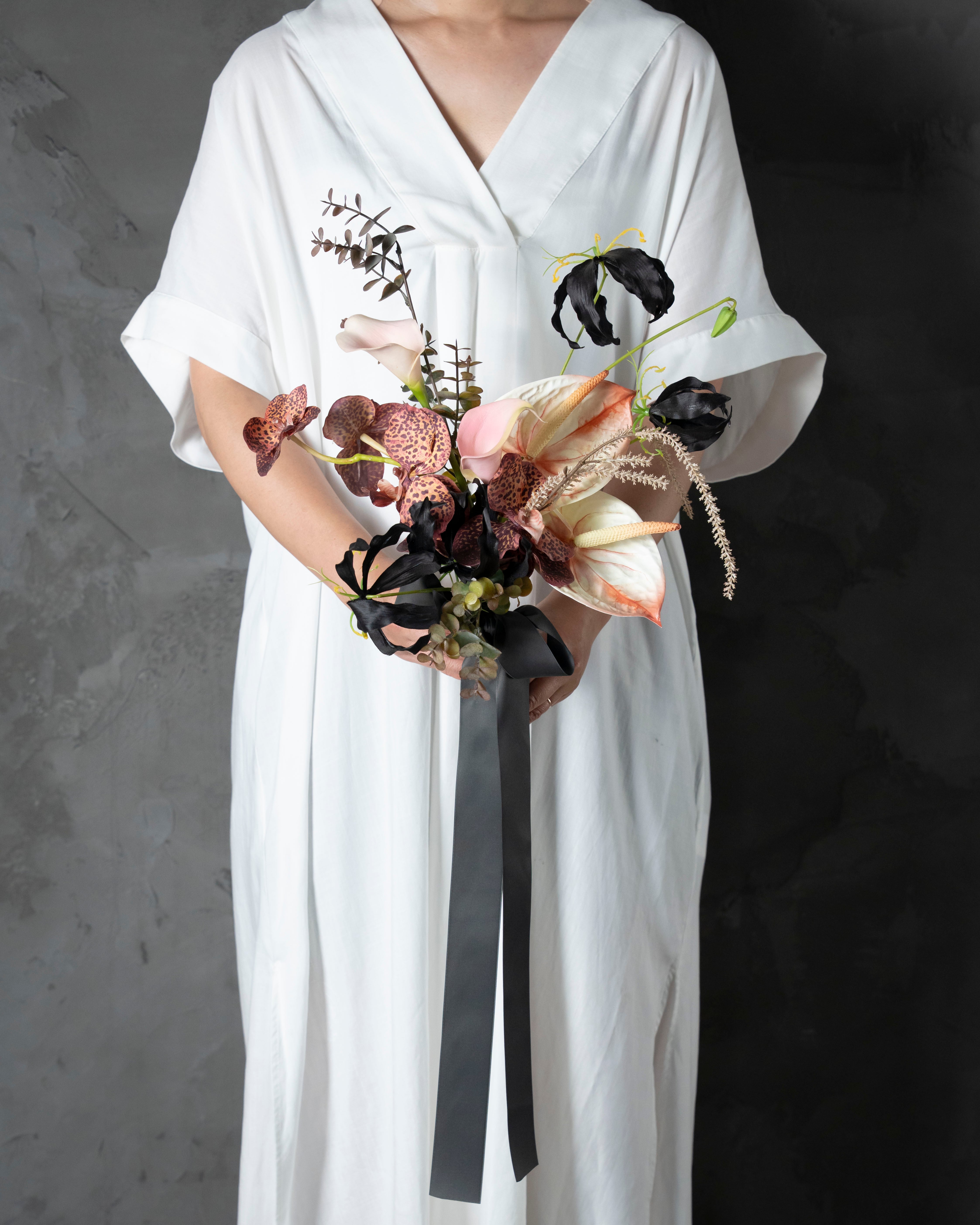 大人な雰囲気を醸す、リアルな質感のアーティフィシャルフラワーのウェディングブーケ。