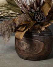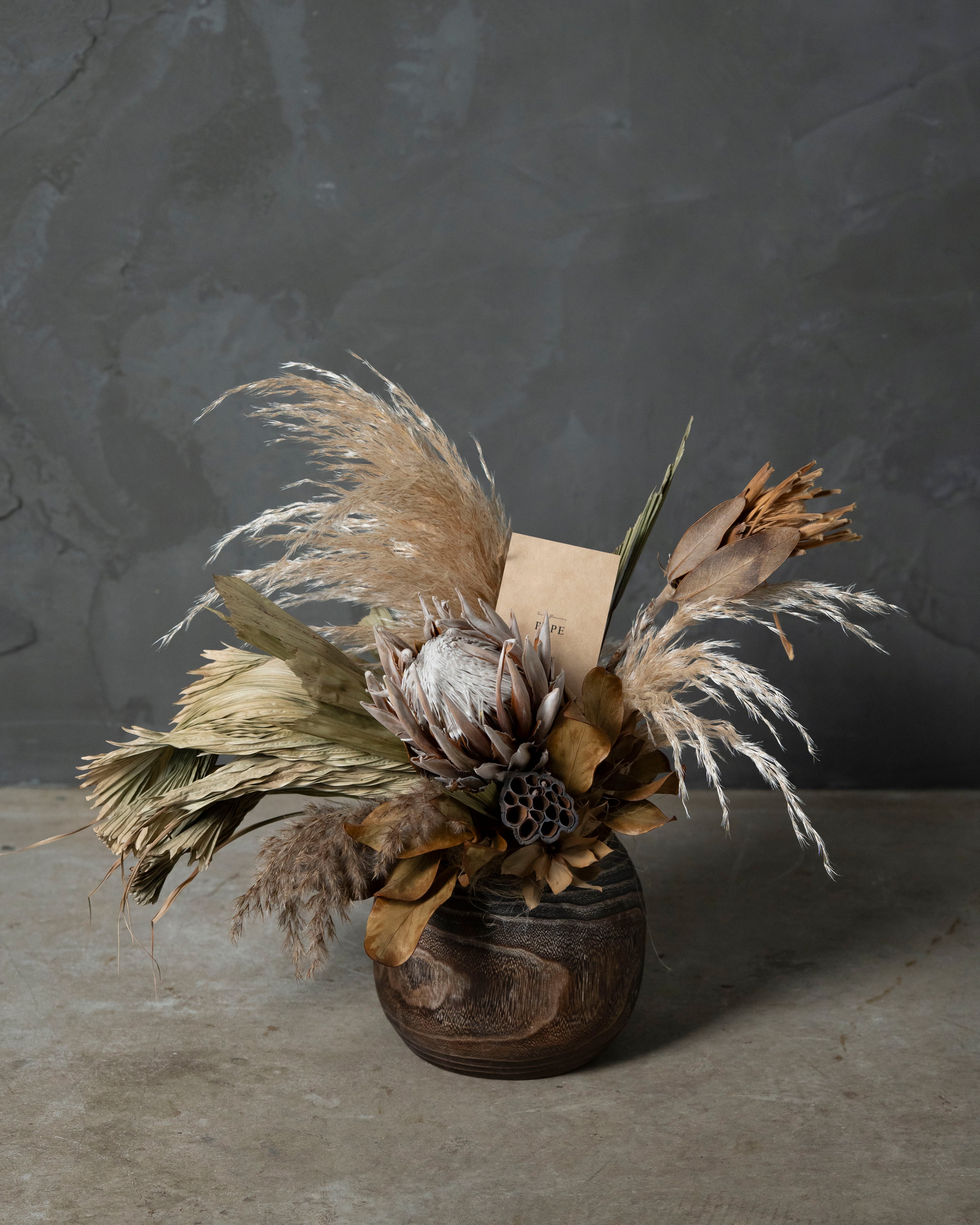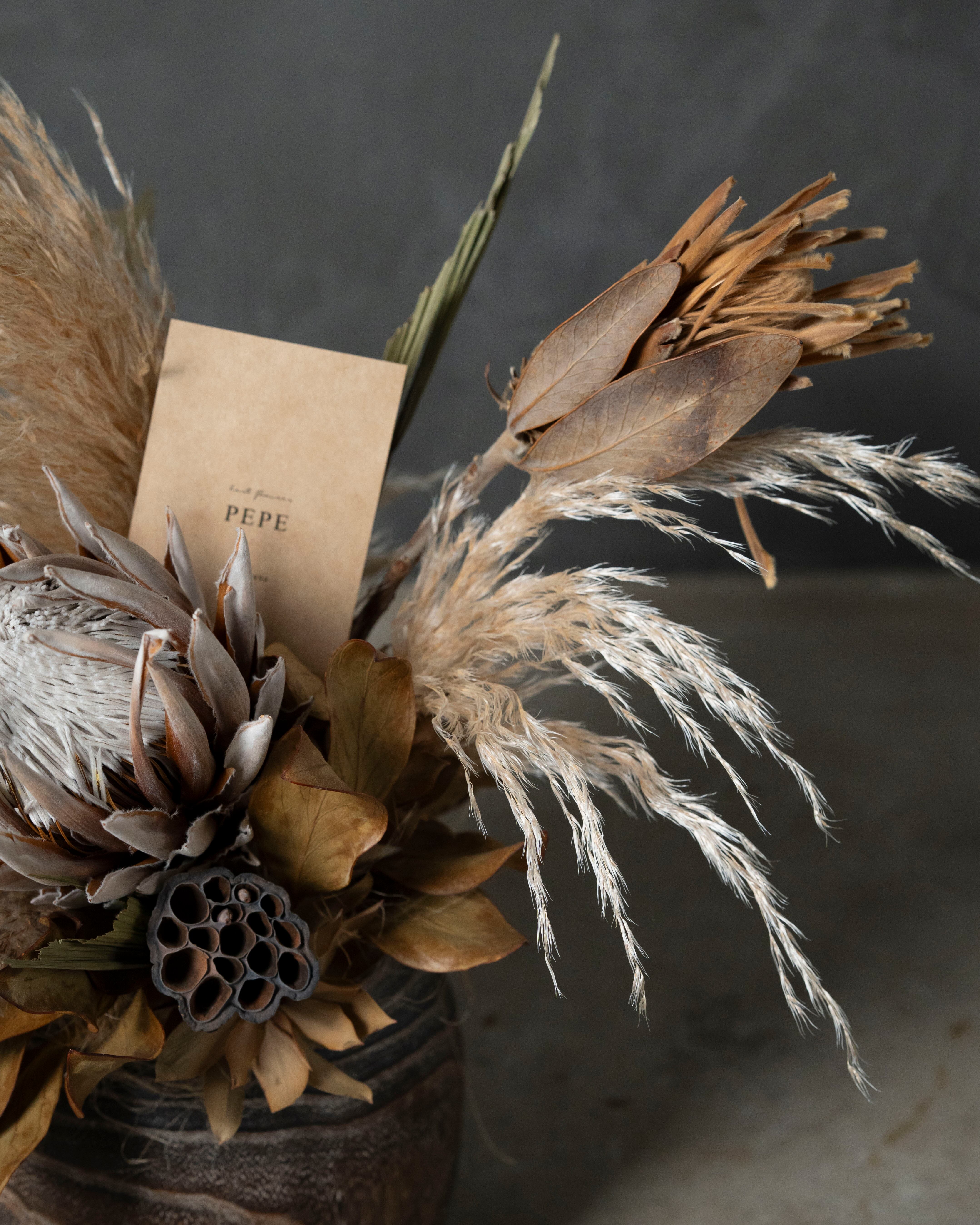 迫力のあるキングプロテア、ウチワヤシ、パンパスグラス、ハスの実などを使った