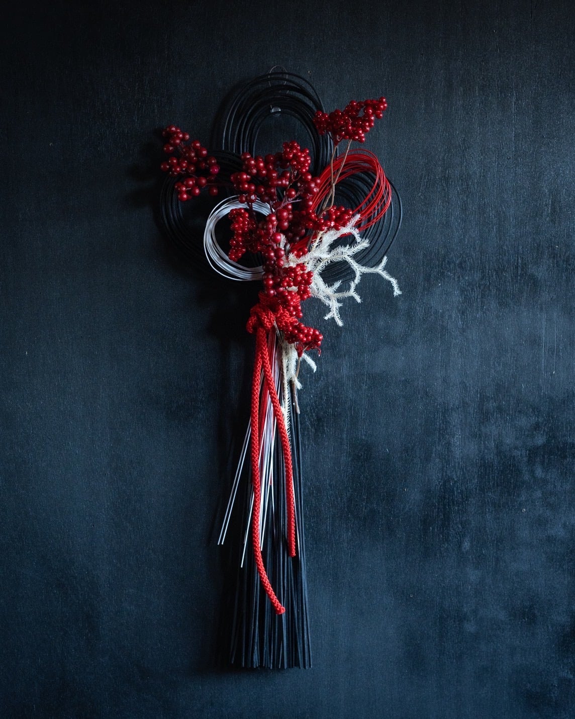 黒のラタンをベースに、鮮やかな南天がたわわに実った様子を表現しました。