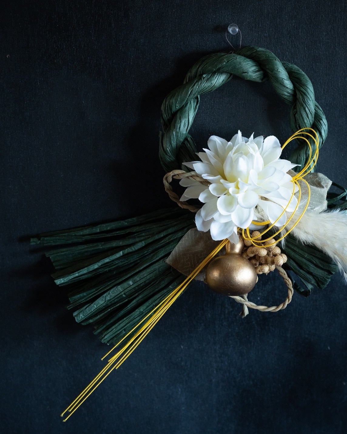 白のダリアを主役にした、深みのあるグリーンが印象的なお飾りです。