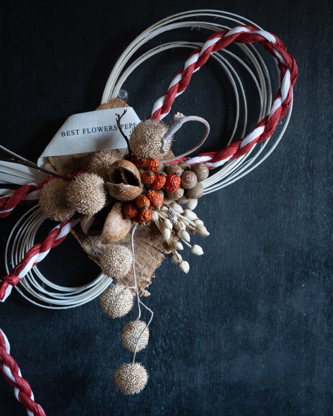 紅白のリボンのようなシルエットに色々な種類の実ものがたくさんついた
