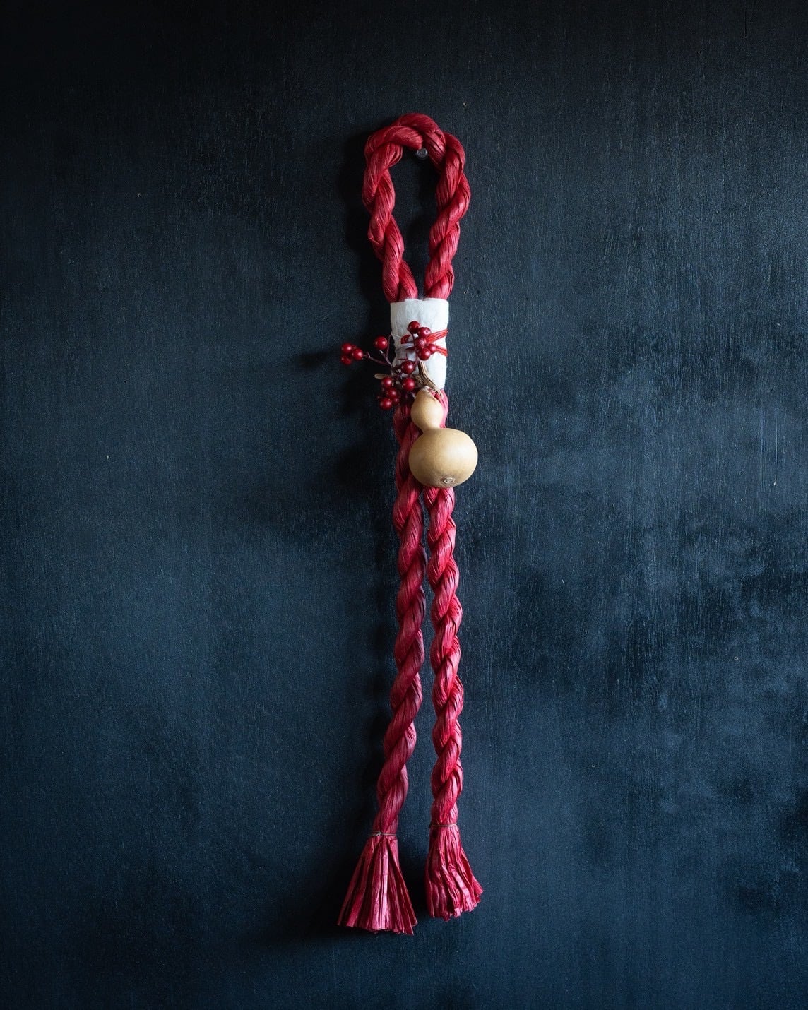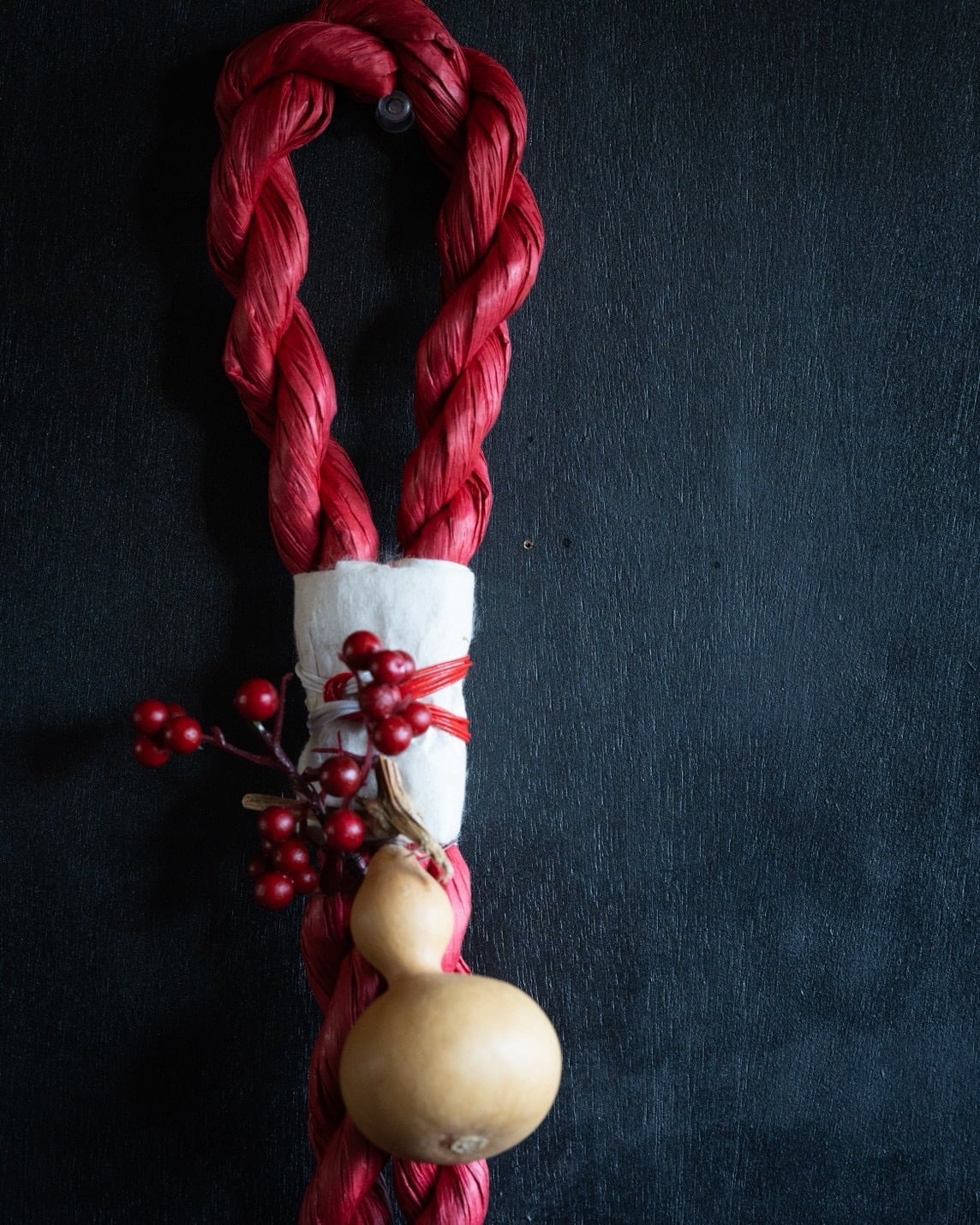 ひょうたんをメインにした赤のしめ縄がなんともおめでたいお飾りが出来上がりました。