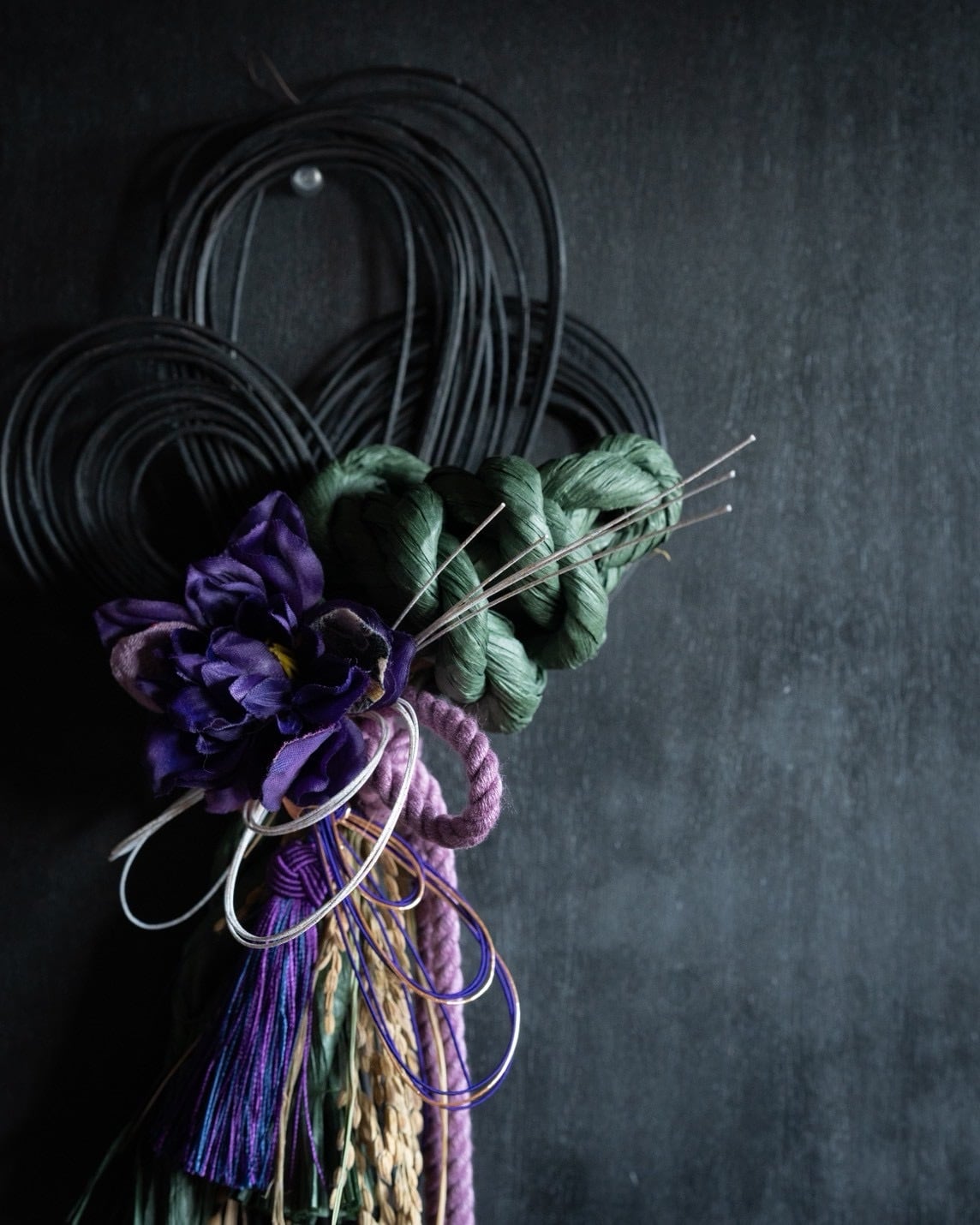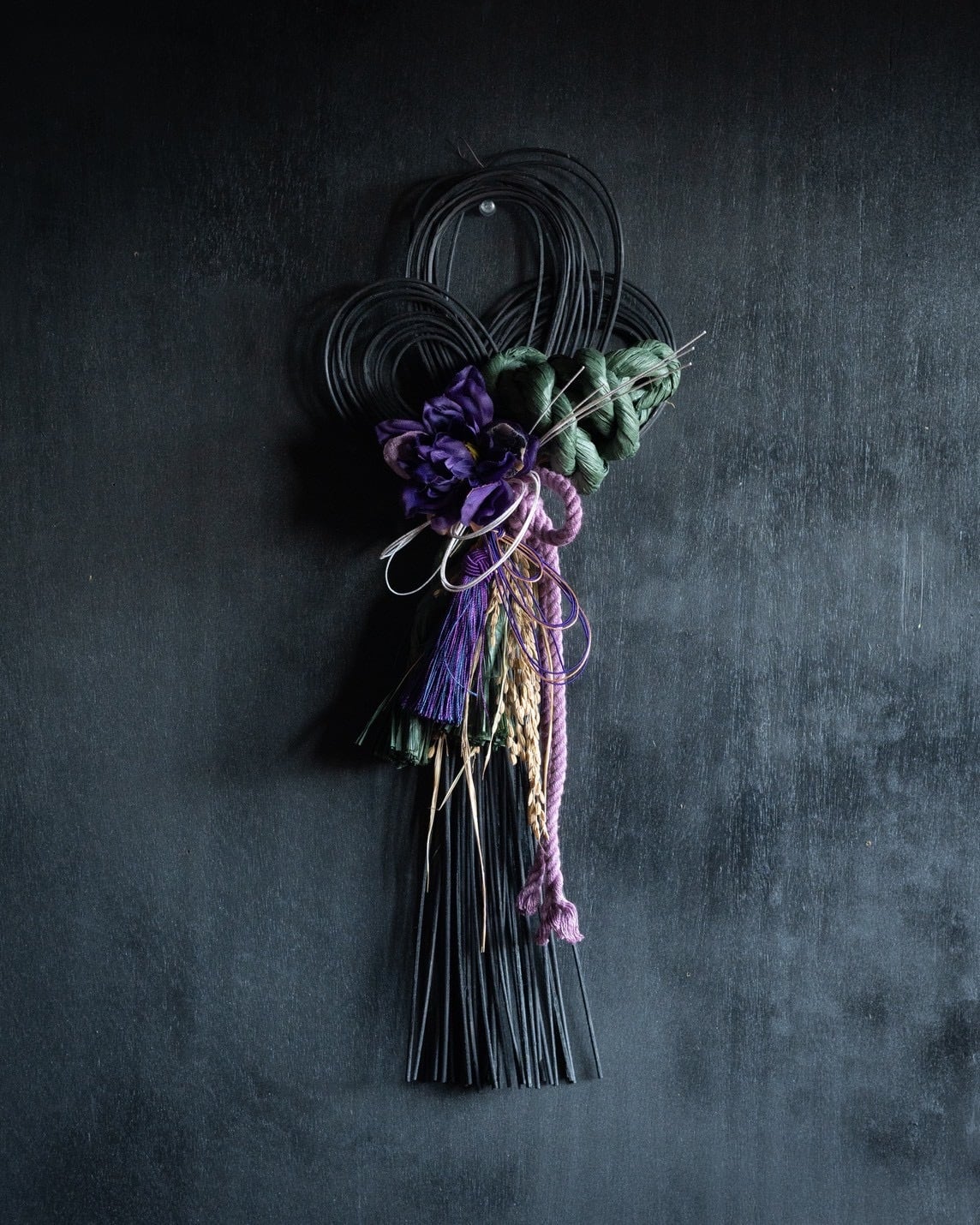黒のラタンをベースに紫のお花を合わせたクールなお飾りです。