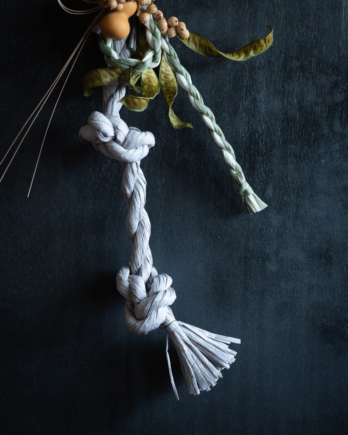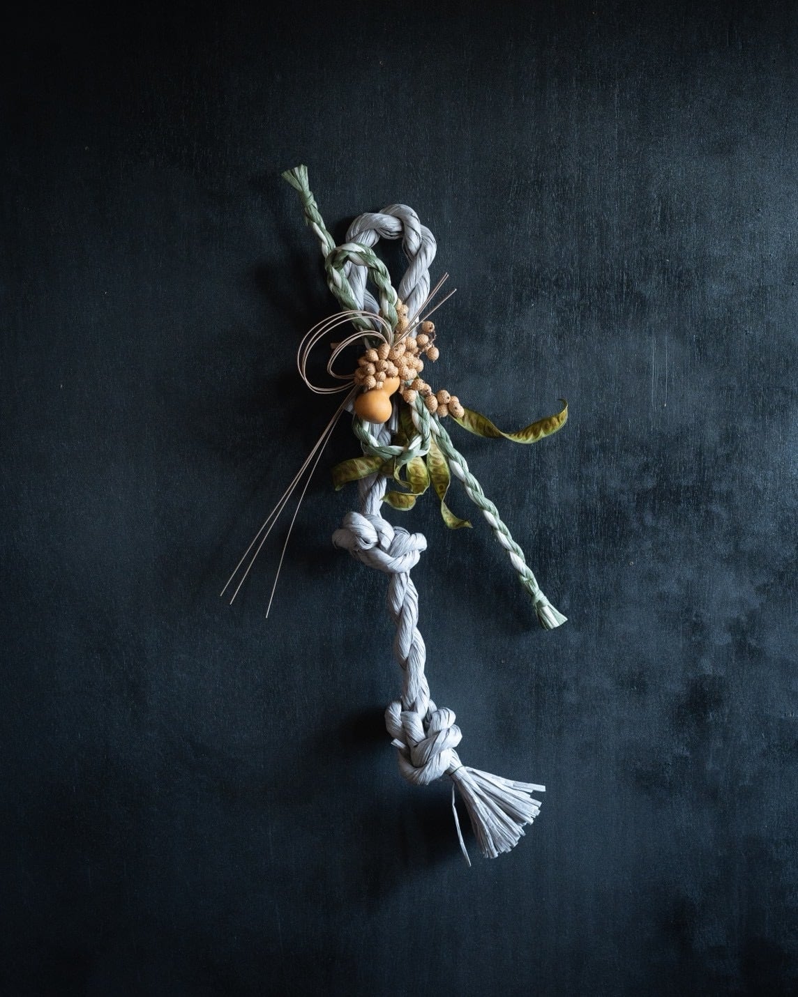 ほんのりとした色合いのグレーのしめ縄をベースにしたナチュラルなお飾りです。
