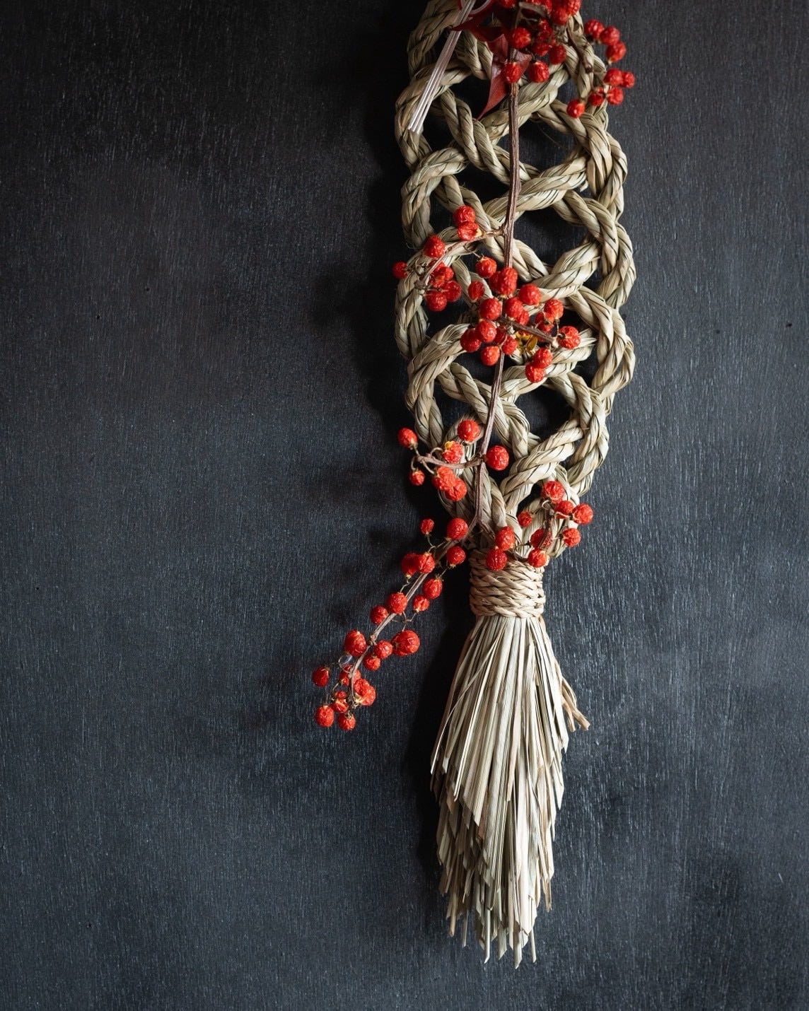 規則的なしめ縄と自然な動きの実が対照的で、風情があります。