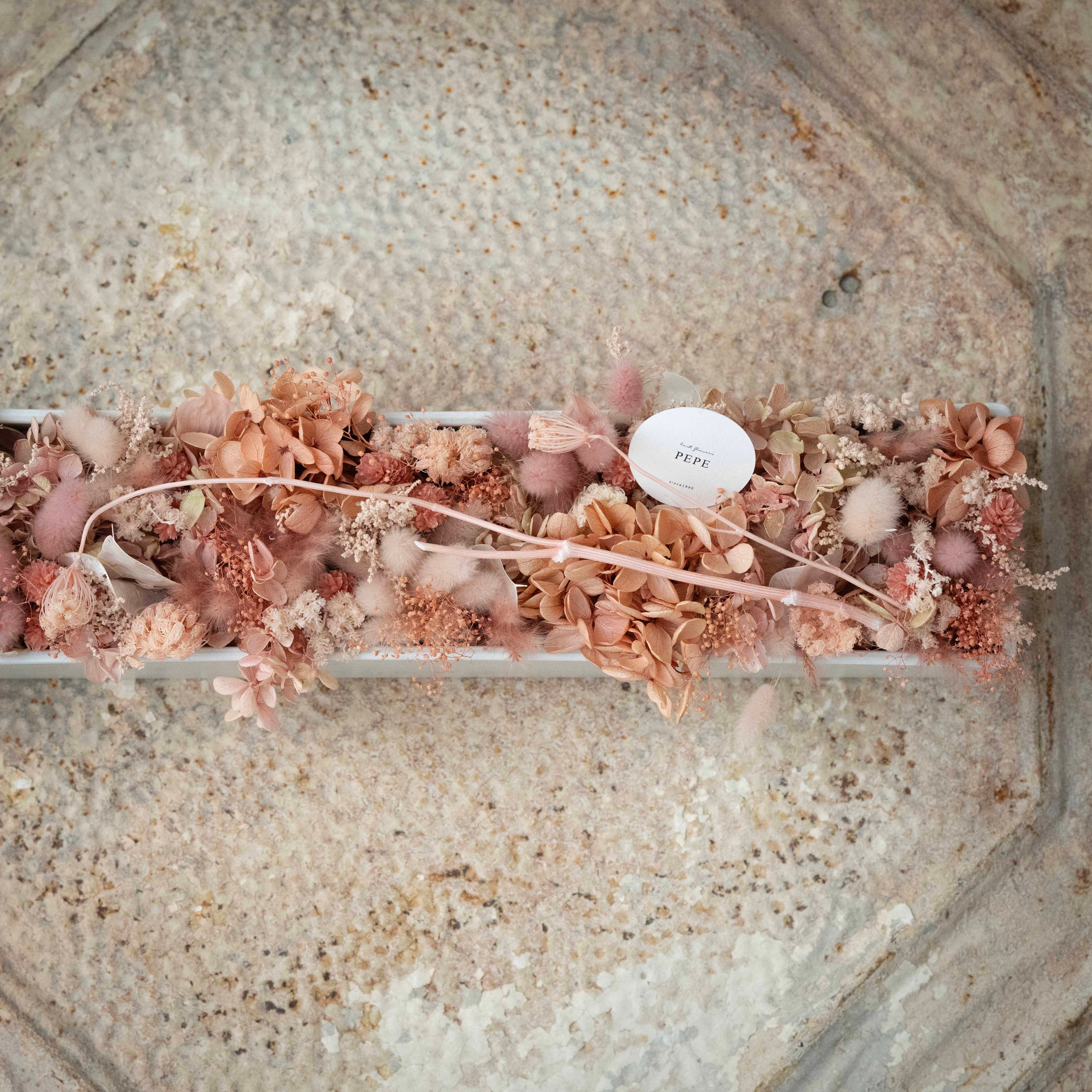 やわらかなピンクベージュの花々を丁寧に重ねた、